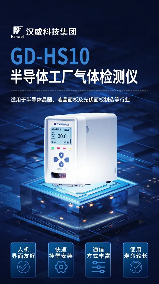 汉威科技针对半导体行业推出的气体安全检测解决方案,搭载如GD-HS10半导体工厂气体检测仪等高灵敏度、高可靠性设备,支持对上百种危险气体的实时监测与早期预警,通过智能化平台实现“早发现、早预警、早处置”,为洁净室与生产线提供持续安全保障。