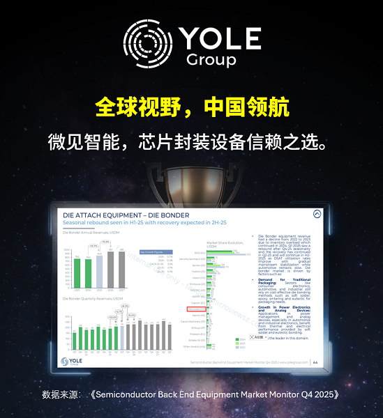 微见智能成立于2019年,聚焦高精度复杂工艺芯片封装设备研发与制造,坚定推行“产品领先、效率驱动、全球市场”三大核心战略。近年来,微见智能产研能力持续跃升:四期交付中心已完成扩产,固晶机年产能提升至1200台,标准设备交货周期缩短20%以上;目前,微见智能固晶机已实现批量出口,是少数能与国际巨头正面竞争的国产高端封装装备厂商——在全球权威半导体行业媒体Yole集团的报告中,微见智能作为中国芯片封装设备供应商受到持续关注与认可。